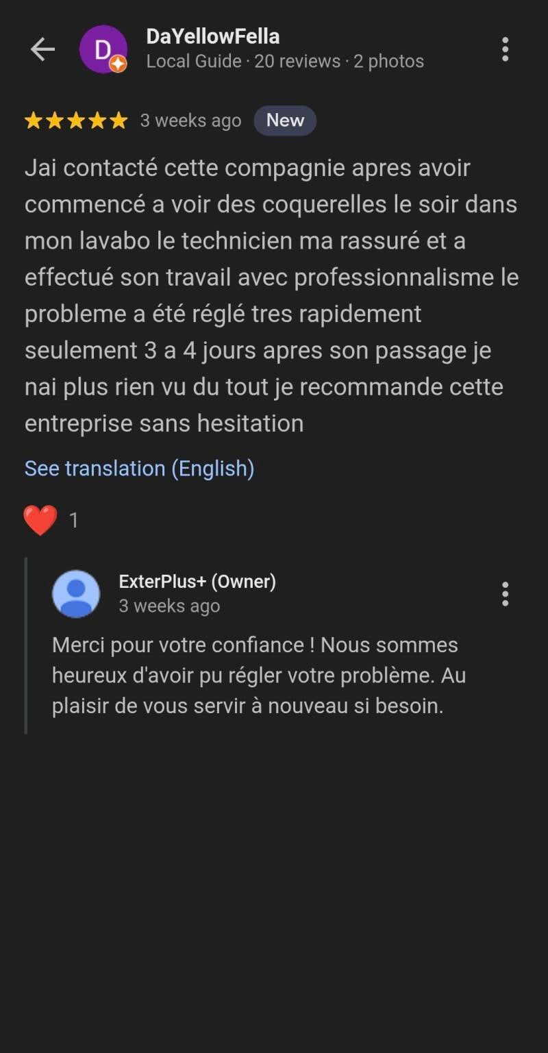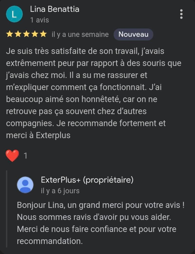 ExterPlus+ est une compagnie d'extermination reconnue pour son engagement à fournir des services de qualité à ses clients. De nombreux avis témoignent d'une satisfaction générale quant à l'efficacité de leurs traitements et à la professionnalité de leur équipe. Les clients apprécient particulièrement la rapidité d'intervention,, souvent en moins de 24 heures après l'appel. Les techniciens d'ExterPlus+ sont souvent décrits comme courtois, compétents et prêts à répondre à toutes les questions. Plusieurs clients mentionnent également la transparence des tarifs, ce qui donne un sentiment de sécurité avant de s'engager dans un service d'extermination. En plus, la garantie de satisfaction offerte par ExterPlus+ renforce la confiance des clients dans leurs services. Les avis soulignent également l'approche respectueuse envers l'environnement grâce à l'utilisation de produits moins nocifs. Cela est particulièrement apprécié par ceux qui ont des enfants ou des animaux de compagnie. En somme, ExterPlus+ reçoit généralement des avis positifs pour son expertise en extermination, sa réactivité et son souci d’un service client de qualité. Pour ceux qui cherchent une solution d'extermination fiable et efficace, ExterPlus+ semble être un choix judicieux.